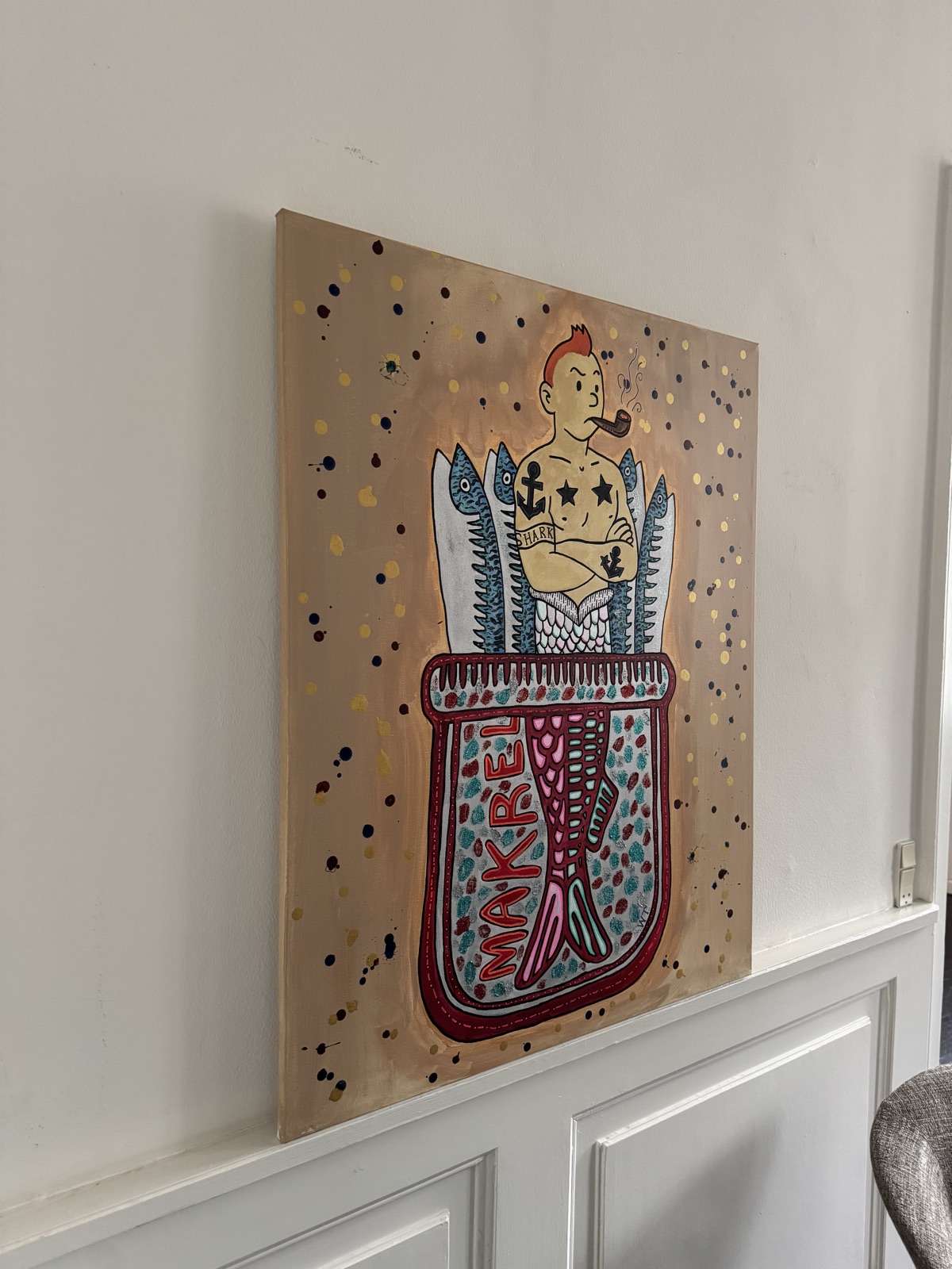 Et humoristisk og kontrastfyldt værk, hvor det menneskelige og det maritime smelter sammen. Figuren står rank og selvsikker, halvt menneske, halvt fisk, indrammet af stærke konturer og et levende farvespil. De varme baggrundstoner brydes af kølige blå og røde detaljer, som giver motivet dybde og rytme. “FISHY” leger med identitet, styrke og absurditet - og efterlader et udtryk, der både er skævt, selvironisk og markant.
