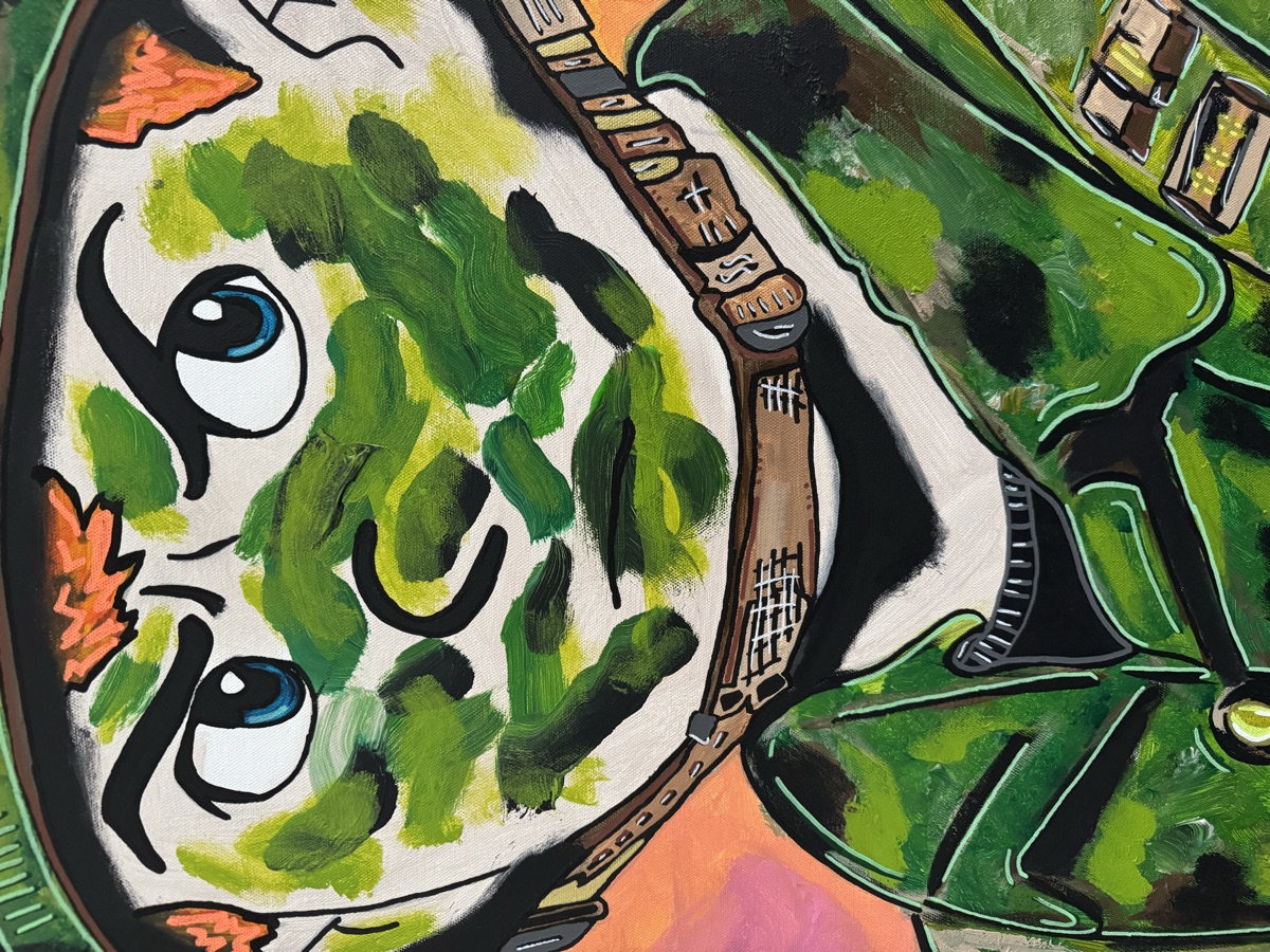 Et kraftfuldt og konfronterende værk, hvor det militære udtryk møder et næsten tegneserieagtigt formsprog. Den intense figur med camouflage i ansigtet og det fokuserede blik står skarpt mod den lyserøde baggrund, som skaber en stærk visuel spænding. Farverne balancerer mellem alvor og ironi og giver motivet en dobbelthed, hvor styrke, moral og konsekvens flettes sammen. “KARMA SOLDAT” peger på handling og ansvar - og på, at intet sker uden modspil.